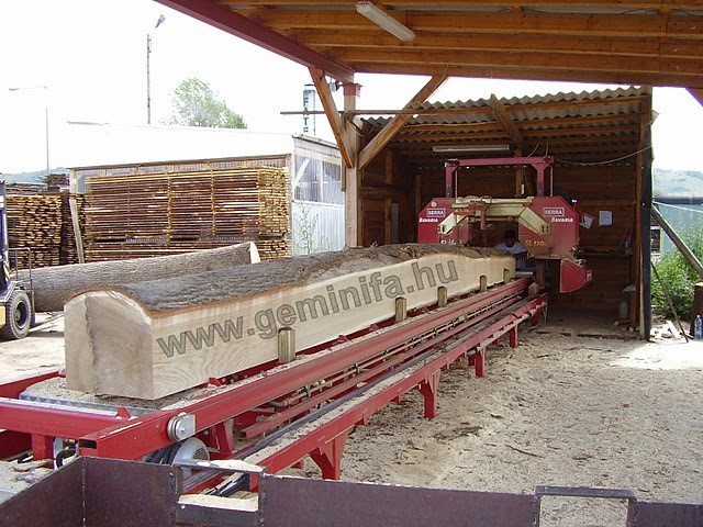 Rönkfeldolgozásunk alappillérét egy vízszintes rönkhasító szalagfűrész képezi, mely a legkorszerűbb német technológia segítségével rendkívüli pontosságot, felületi minőséget és magas kihozatalt biztosít Ezzel a géppel akár a 1,5 m átmérőjű rönkök feldolgozását is vállalni tudjuk. Vágási teljesítmény 1-3 m3 / óra, fafajtól, hossztól és vágási méretektől függően, amely kategóriájában kimagasló teljesítmény.